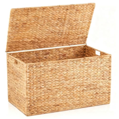 Klippehop Handwoven Water Hyacinth Storage Trunk with Lid - 160L Large Wicker Blanket Box & Toy Chest - Rattan Storage Basket with Metal Frame & Handles for Bedroom, Living Room - 76x45x45cm, Natural