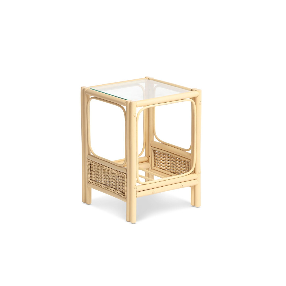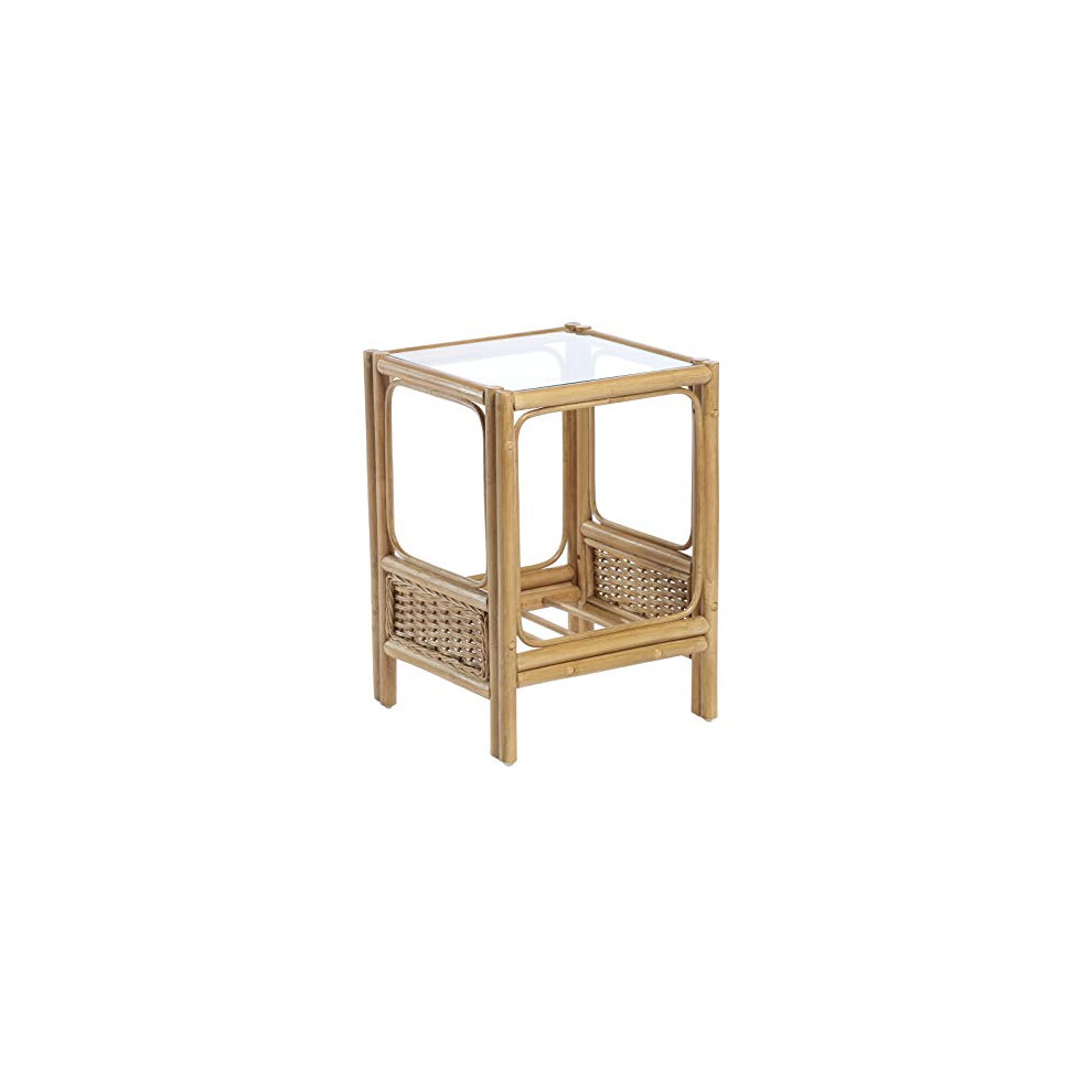 Desser Vale Lamp Table with Storage Shelf ? Glass Top Side Table with Natural Wicker Rattan Cane Frame ? Light Oak Finish Indoor Conservatory or
