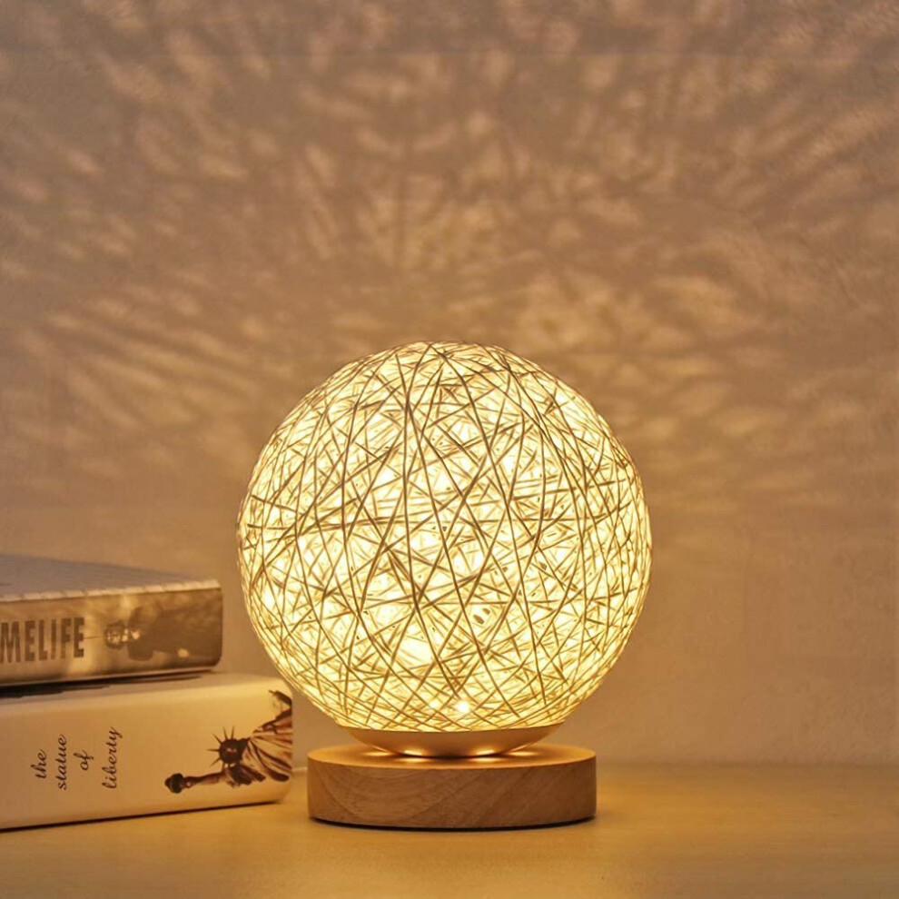 Wood Table Lamp, LED Night Light Lamp with Hand-Knit Wicker Rattan Spherical Ball and USB Charger(White)