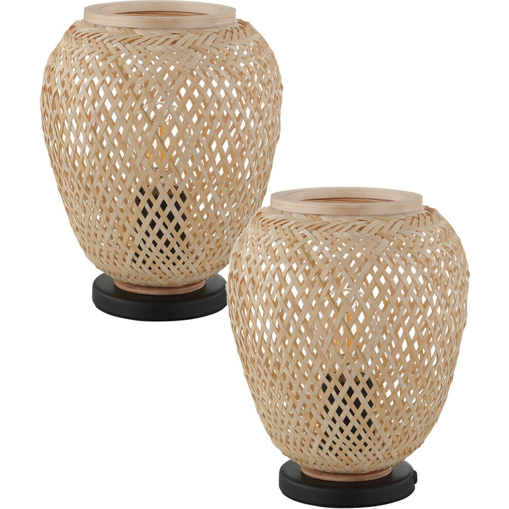 2 PACK Table Lamp Desk Light Black Base & Round Wicker Wood Shade 1x 40W E27