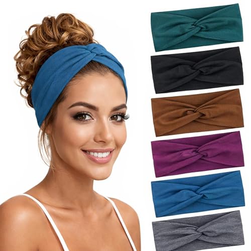 6 PCS Wide Soft Elastic Headbands for Women – Twisted Knot Hair Bands & Sweat Absorbing Hair Accessories for Yoga, Sports, Gym and Daily Wear, Comfortable Stretch Fit (Dark-6PCS)