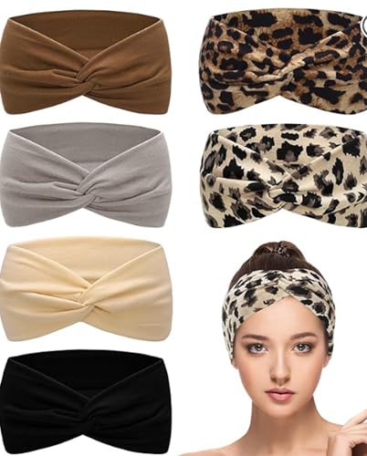 6 Pcs Headbands for Women, Elastic Wide Soft Boho Headbands for Yoga, Sports & Fashion, Non-Slip Hair Accessories Set - Leopard Print & Solid Color Mix