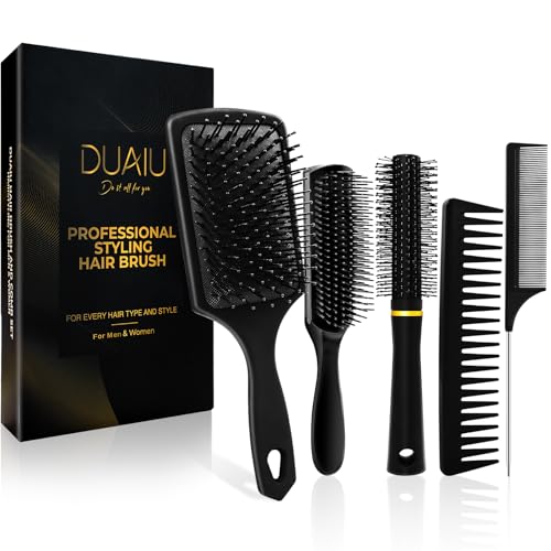 DUAIU 5 Pcs Hair Brush for Men and Women Styling Hair Comb Set for All Hair Types Paddle Brush Detangling Brush Quiff Round Hair Brush Wide Tooth Comb Rat Tail Comb for Dry or Wet Hairdressing Tools
