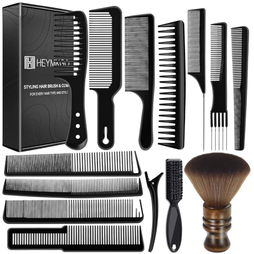HEYMKGO 14 Pcs Professional Barber Hair Comb Set for Men & Women, Hair Cutting Kit with Wide Tooth Comb, Rat Tail Comb, Clipper Brush, Neck Duster, Styling Clips for Salon Grooming Tools (Black A)