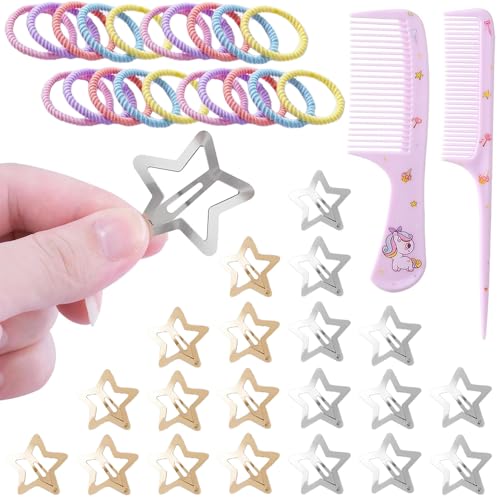 Bmeigo 42pcs Hair Accessories for Girls with Storage Box - Small Star Hair Clips Silver & Gold, Hair Ties and Combs Set Colourful Hair Bands Rat Tail Wide Tooth Comb for Kids 2-8 Year Old Styling