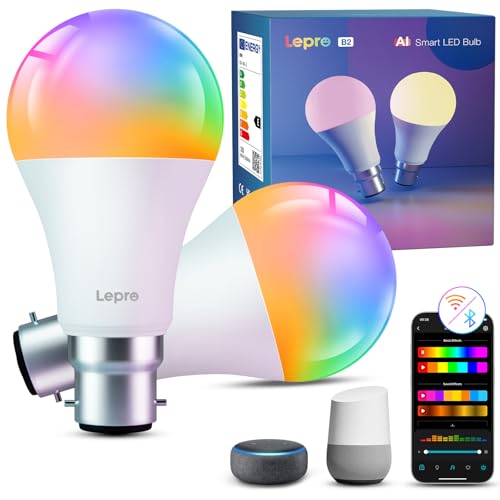 Lepro 10w B2 AI Smart Bulb Bayonet, 1100lm WiFi Bulb B22, Music Sync Colour Changing Light Bulbs, Voice Control, AI Lighting Design Assistant, Works with Alexa & Google Assistant, RGB Dimmable,2 Packs