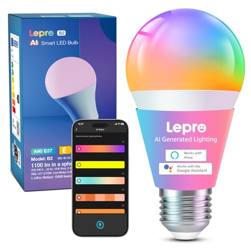 Lepro B2 AI Smart Bulb E27, 1100LM Music Sync Bluetooth & WiFi Bulb, Voice Control Screw Light Bulbs, RGBCCT, AI Lighting Design Assistant, Colour Changing Bulb, Work with Alexa & Google Assistant