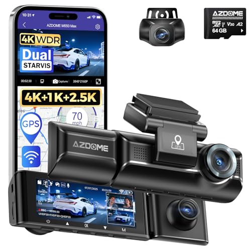 AZDOME 4K 3 Channel Dash Cam, 4K+1080P+2.5K Dash Cam Front and Rear Inside, STARVIS Sensor, WiFi GPS, 150° Wide Angle dashcam, 6-LED IR Night Vision, WDR, 64GB Card, 24H Parking Mode, 3.19" Screen