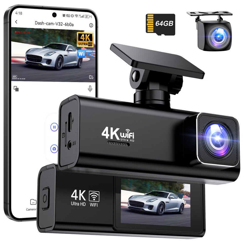 DYNACAM Dash Cam Front and Rear 4K+1080P, Dash Cam Inserted 64GB SD Card, Built-in WiFi Dash Camera for Cars, Super Night Vision Dashcam, 24H Parking Mode, G-Sensor, Loop Recording Car Camera