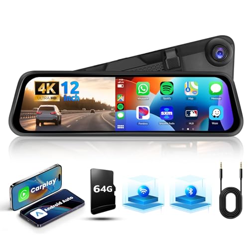 Hodozzy 4K Mirror Dash Cam with 12 inch Touchscreen, WiFi Rear view Mirror Dash Cam Front for Car with Carplay Android Auto, Car Camera with Bluetooth WDR Recording G-Sensor, Airplay FM AUX 64GB Card