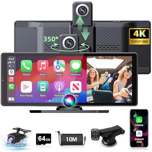Apple Car Play Screen Android Auto with 350° Rotatable 10.26 inch Car Tablet Pro Max, 4K Dash Cam with Front and Rear Backup Camera Dual Bluetooth Navigation Voice Control Siri G-oogle