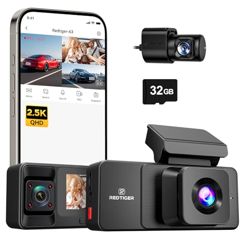 REDTIGER 2.5K 3 Channel Dash Cam with WiFi, 2.5K+1080P+1080P Dash Cam Front and Rear Inside, 3.18'' Screen, Included 32GB Card, IR Night Vision, Loop Recording, 24H Parking Mode, Support Max 256GB(A3)