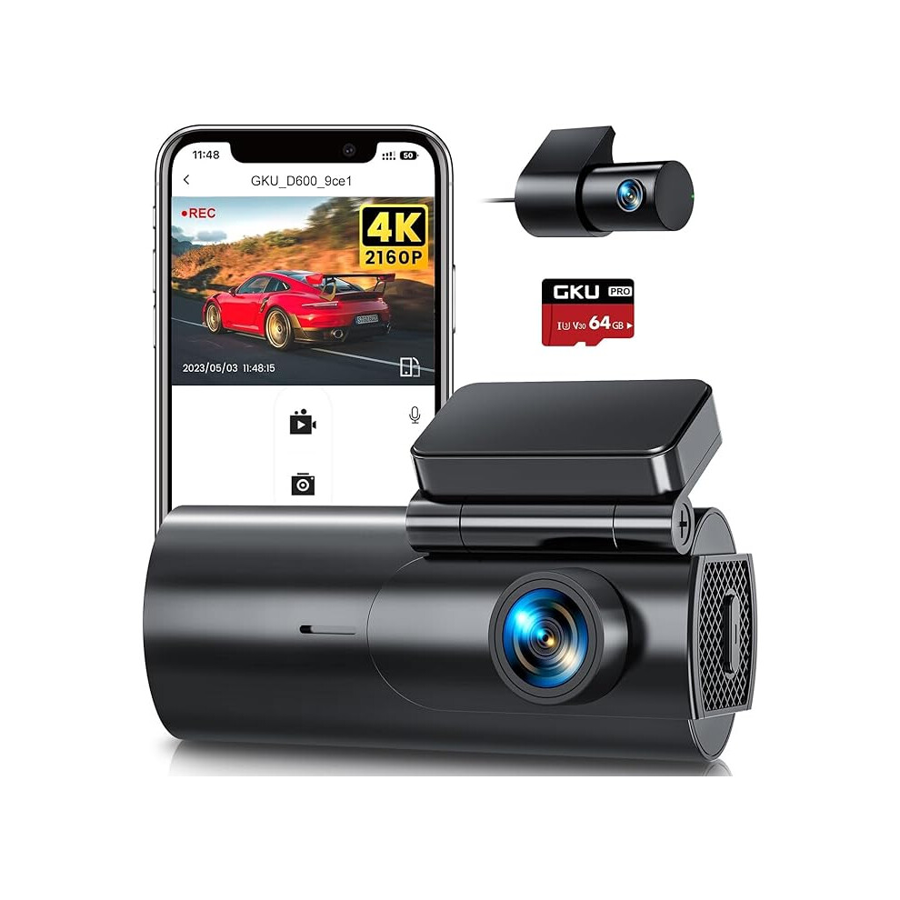 GKU 4K Dash Cam Front and Rear, 5GHz WiFi Dashcam with 64GB SD Card, Dual Car Camera Dash Cam with Parking Monitor, Night Vision, WDR, 170? Wide