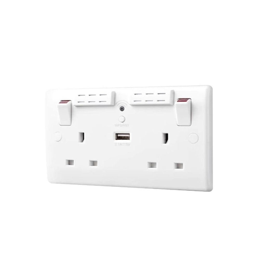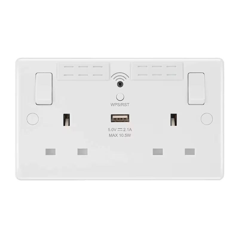 13A 2 Gang Switched Socket with Wi-Fi Extender + 1x Usb-A 2.1A Round Edge White (822UWR-01)
