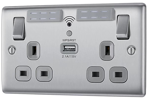 BG Bg Brushed Steel 13A Black Insert Wifi Extender & USB Socket 2 Gang + 1 2.1A