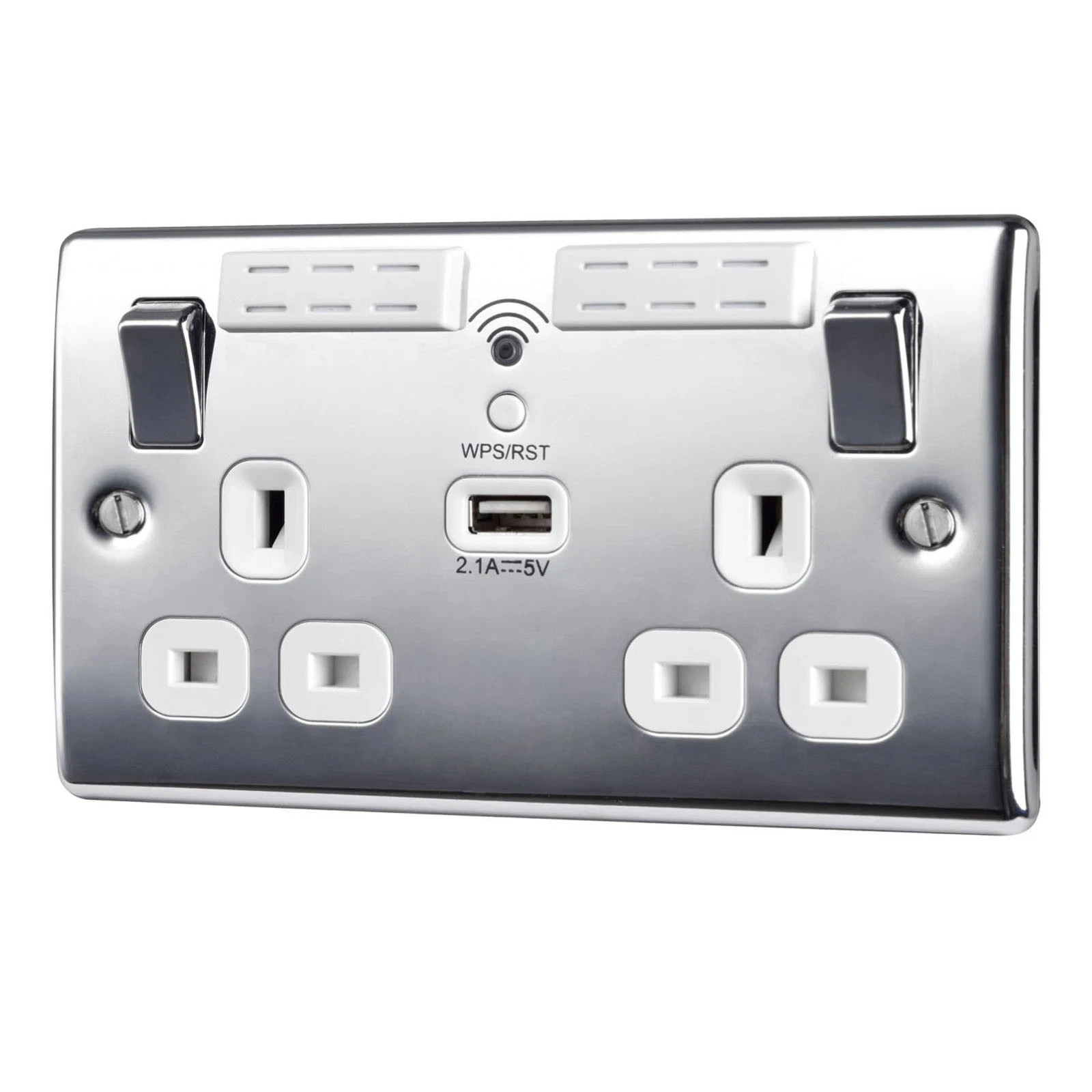 BG WiFi Extender Double Socket Switched USB Raised Slim Chrome 13A 240V