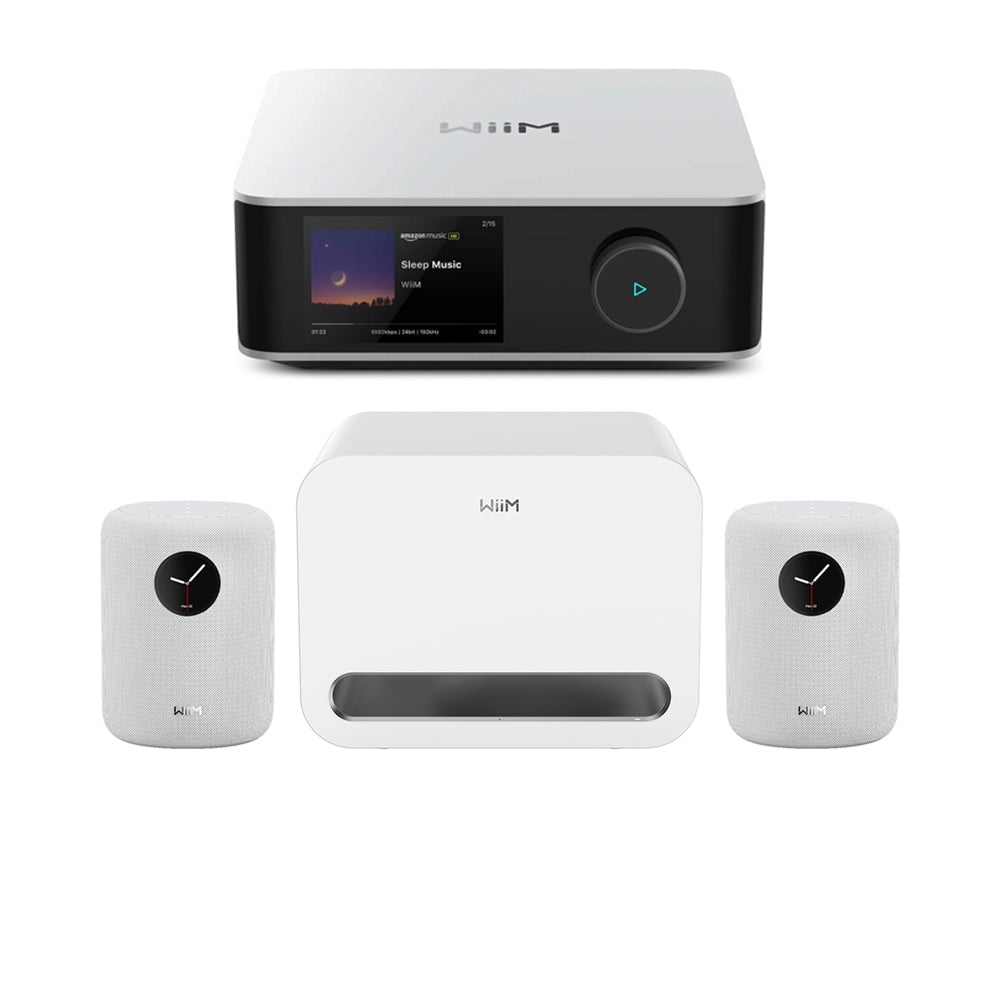 WiiM AMP ULTRA Streaming Amp Silver with WiiM Sound Mulitroom Speakers Pair & Sub Pro Subwoofer White HiFi Package