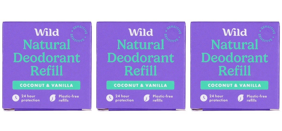 WILD Coconut & Vanilla Plastic FREE Natural 24 hour Deodorant Refill 40g-3 Pack