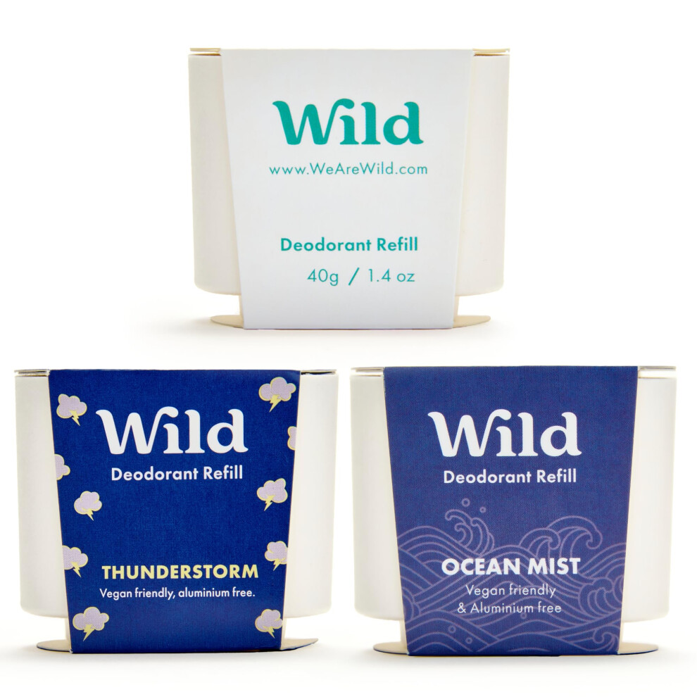 Wild - Natural Refillable Deodorant Variety Pack with Clean Fresh Scents - Aluminium Free - Scents Include Fresh Cotton & Sea Salt, Ocean Mist & Thunderstorm - Long Lasting Protection