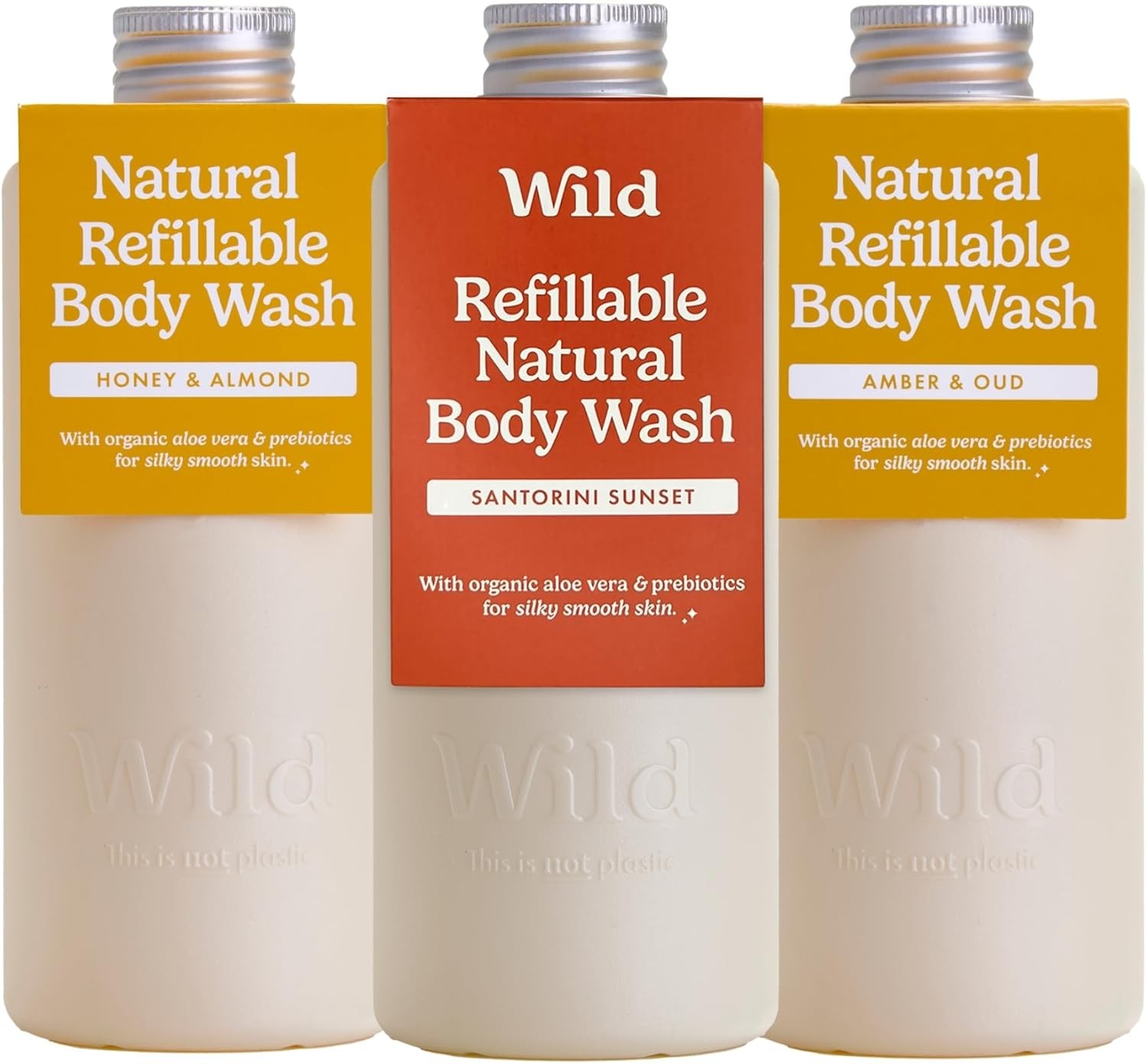 Wild Natural Refillable Body Wash 300ml - 3 Pack of Shower Gel Refills in a Variety of Scents - Includes Honey & Almond, Amber & Oud and Santorini