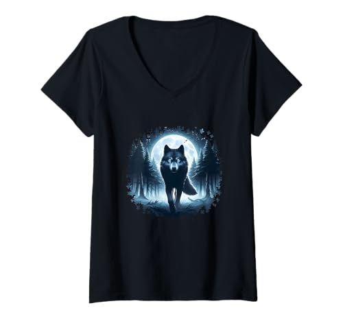 Womens Wild Echoes Howling Wolf Forest Reflection V-Neck T-Shirt