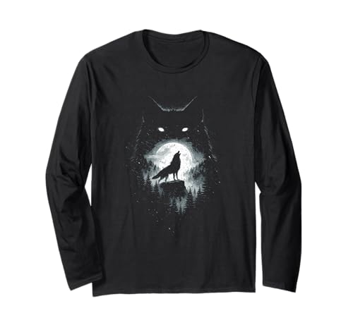 Wild Wolf Howling at Full Moon Forest Silhouette Grunge Art Long Sleeve T-Shirt