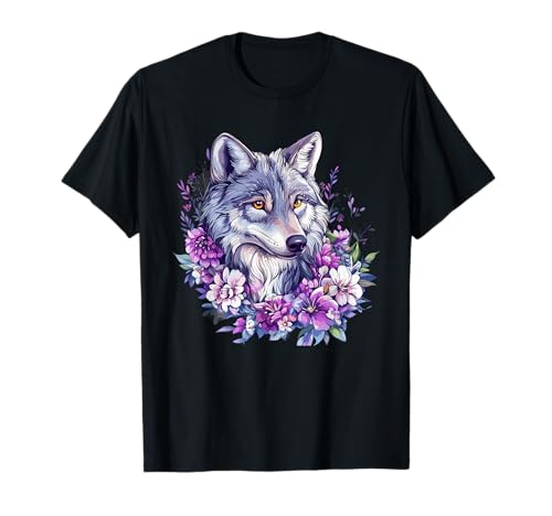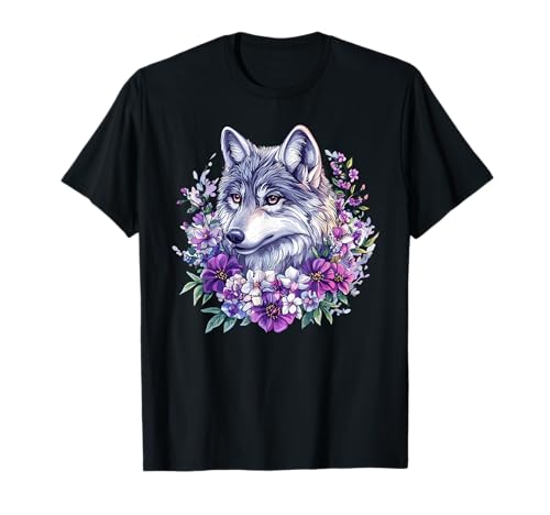 Wild Wolf with Purple Flowers Forest Spirit T-Shirt
