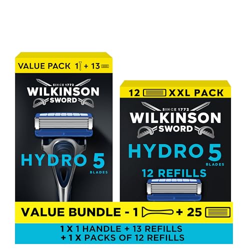 Wilkinson Sword Hydro 5 Skin Protection Razor, Carbon Coated 5 Blades, Hydrating Gel, Flip Trimmer, 1 Handle + 13 Refills, Men's + Wilkinson Sword Hydro 5 Men’s Razor Refills x 12