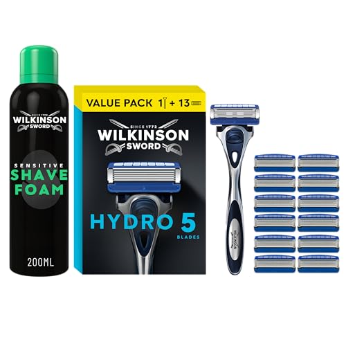 Wilkinson Sword Hydro 5 Razor, Carbon Coated 5 Blades, Hydrating Gel, Flip Trimmer, 1 Handle + 13 Refills, + Wilkinson Sword Sensitive Shave Foam for Men, Sensitive Skin, 200ml