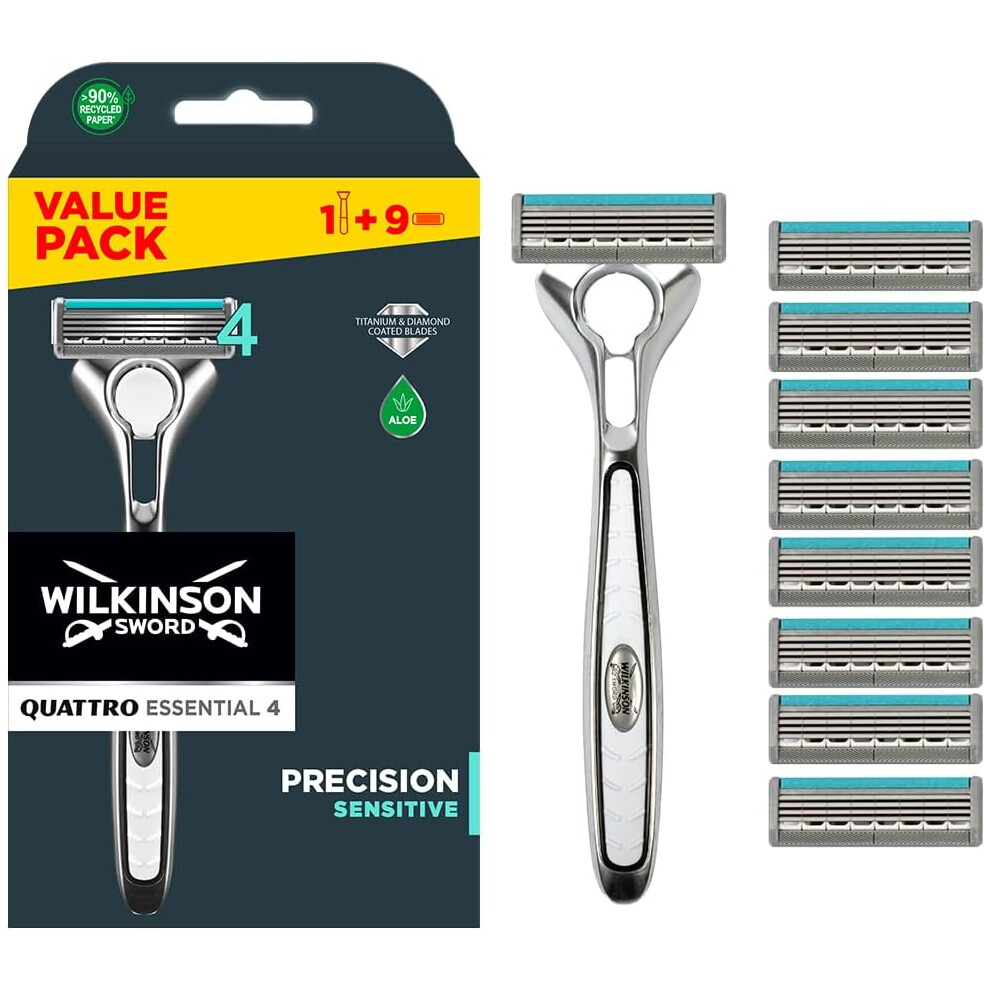 WILKINSON SWORD - Quattro Titanium For Men | Sensitive Comfort | Razor Handle + 9 Blade Refills