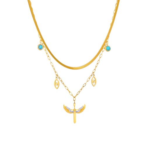 Hao Wu Xuan 316L Stainless Steel Cross Sword Wings Eyes Pendant Necklace For Women Girl Fashion Waterproof Gold Color Jewelry Gift