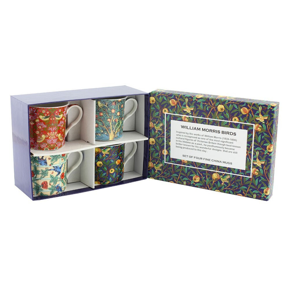 Set of 4 William Morris BirdsFloral China Mugs Tea Coffee Cups Gift Boxed