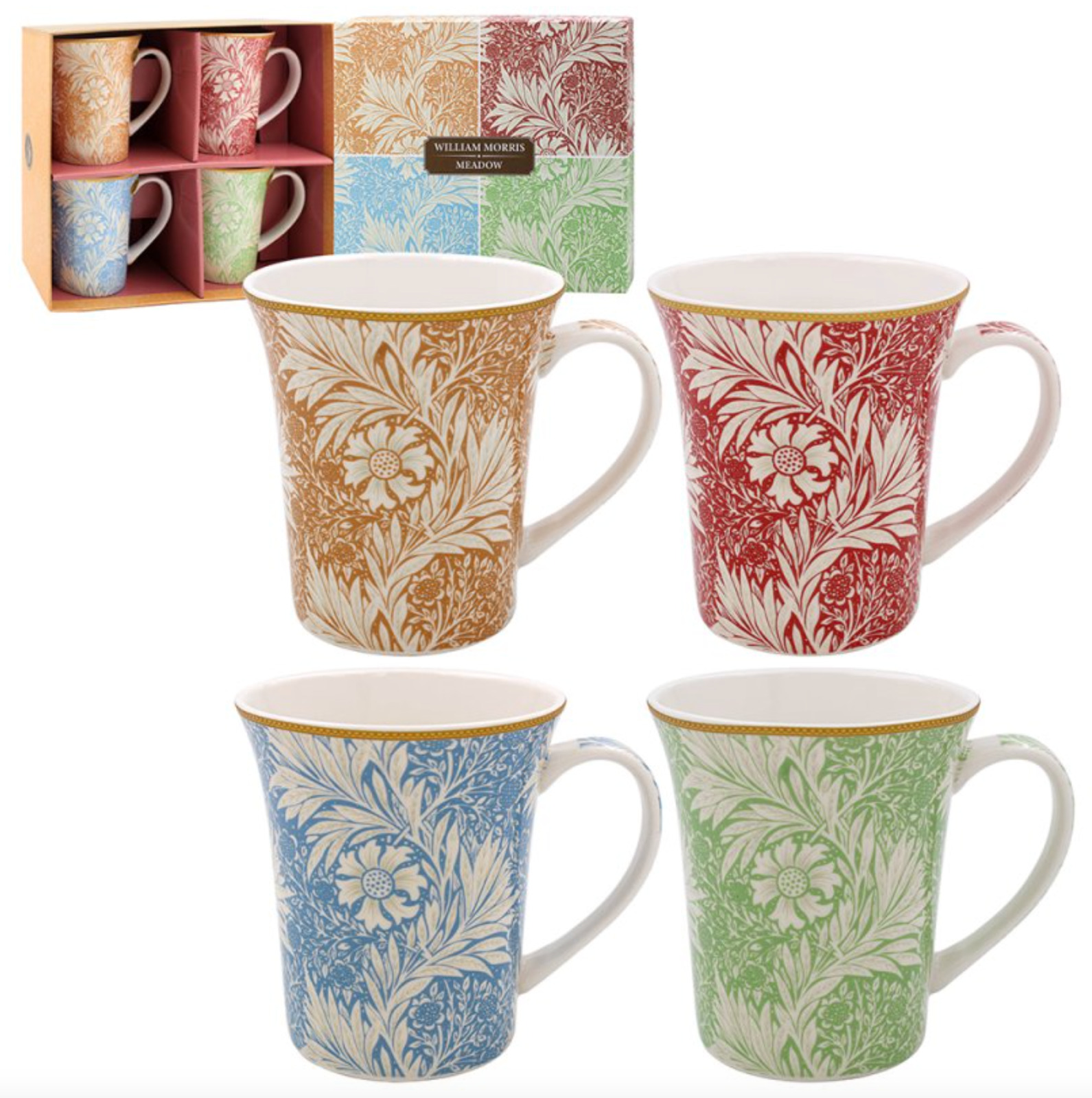 SET OF 4 CHINA MUGS WILLIAM MORRIS MEADOW COFFEE OR TEA MUG SET GIFT BOXED