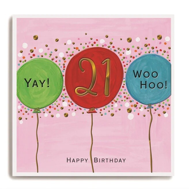 Colourful Balloons 21st Birthday Card - Janie Wilson Illustrated Foil Design