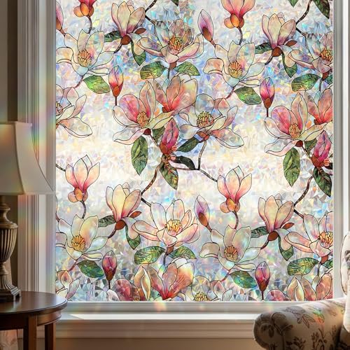 Qualsen Stained Glass Window Films Rainbow Window Film Privacy Film for Glass Windows Magnolia Flower Pattern Self Adhesive Static Cling Decorative Anti UV Windows Vinyl for Home 44 x 200cm
