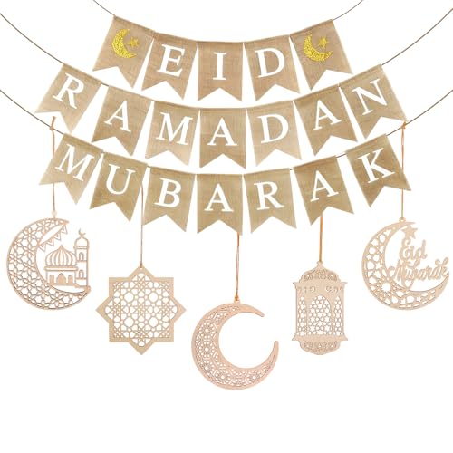 Ramadan Decorations for Home, 24PCS Eid Mubarak Decorations - Ramadan Mubarak Banner Decor, Wooden Lantern Moon Star Castle Shape Ornaments, Hanging on Wall Window Tree Lights for Islamic Muslim Party
