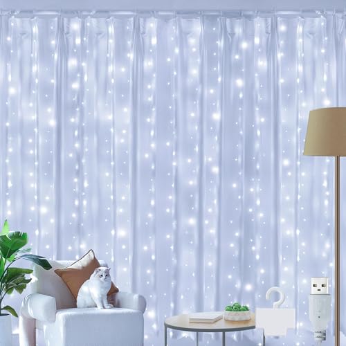 Ollny Curtain Lights Indoor Outdoor, 300LED 3mx3m Window Fairy Lights USB Plug in, Waterproof Waterfall Hanging String Light with 8 Modes for Bedroom/Wall/Outside/Garden/Wedding/Party, Cool White