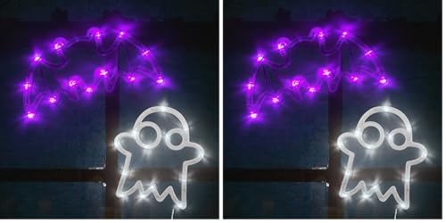Global Gizmos 45939 Set of 2 Halloween Window Lights/Bat & Ghost Design/Efficient LED Strips/Purple & White Colours/Suction Cups Included for Hanging (Pack of 2)