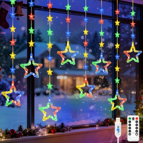 Gcstnn Christmas Star Window Lights, 2M 48 Stars Multicoloured Curtain String Lights USB Powered with Remote Control Timer Waterproof Hanging Christmas Light for Window Bedroom Xmas Tree Decorations