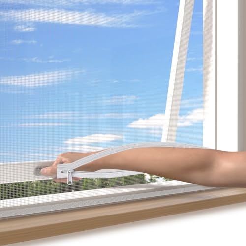 BKSAI Window Fly Screen with Double Zip Opening, Easy to Open & Close Window, Tear-Resistant Fiberglass Mosquito Window Net, Cuttable, Self-Adhesive Window Screen Mesh (White, 130 * 150CM)