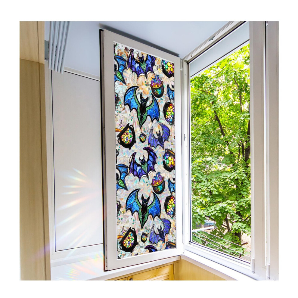 Halloween Window Clings Stained Glass Film with Blue Bat Design, Reusable NonAdhesive Halloween Decorations
