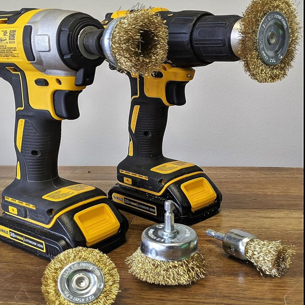 Wire Brush Drill Attachment Set, Brass Coated Steel Bristles Rust Removal Tool for Metal Surfaces, Paint Stripping and Cleaning Deburring with Hex