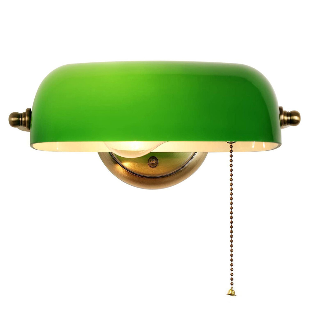 Banker Wall Lamp with Adjustable Shade, Sturdy Glass Cover Retro Reading Light with Pull-Wire Switch, Polished Base Vintage Metal Arm for Room Bedside