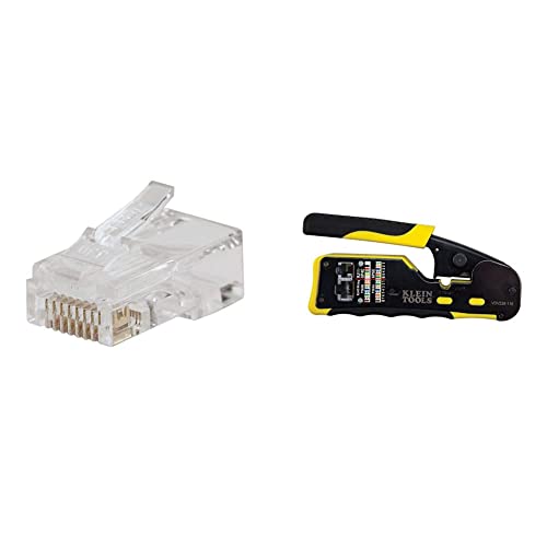 Klein Tools Pass-Thru Modular Wire Crimper, All-in-One Tool Cuts, Strips, Crimps, Fast and Reliable Yellow/Black, Pack of 1 & dular Data Plug, RJ45 CAT6, Pass Through Connectors 50-Pack, Klein Tools