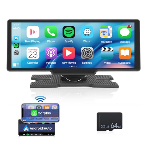 Portable Apple Car Play Screen 10.3 inch IPS Carplay Screen Car Buddy Touchscreen Unit, Wireless Android Auto FM Transmission Bluetooth for 7V-32V Vehicles +64G TF Card