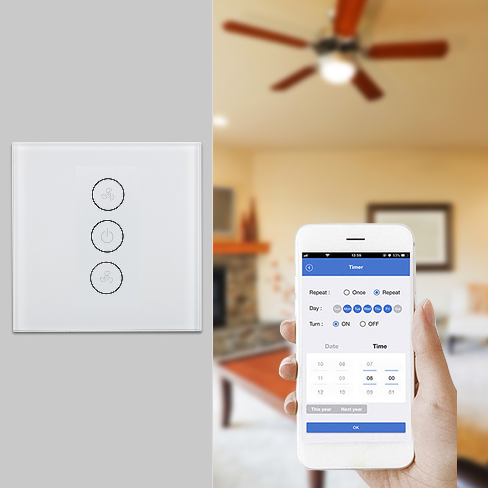 White Smart WiFi Dimmer Fan Switch Wireless Timer Voice APP Control For CT