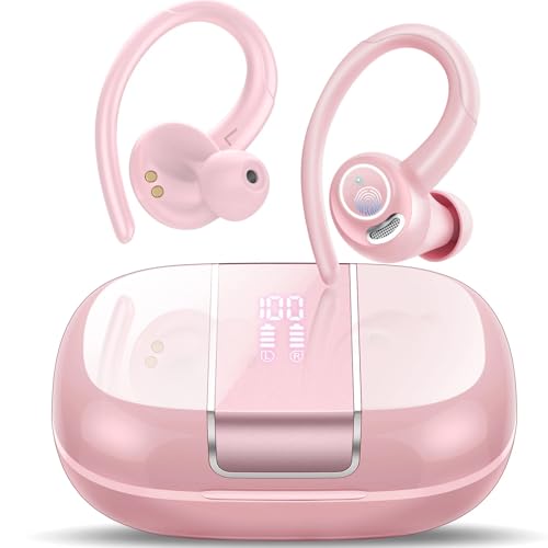 VKROBAG Wireless Earbuds Sport, Bluetooth 5.3 Headphones with ENC Noise Canceling Mic, 48H Ear Buds with Earhooks, 3D Stereo, LED, IPX7 Waterproof Wireless Earphones for Running, Gym, Workout, Pink