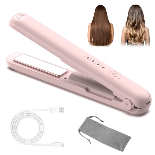 HUIJUTCHEN Cordless Hair Straightener, Mini Travel Flat Portable Wireless Rechargeable 2 in 1 Straightener and Curler Styling Tools Quick Heat Up & 4 Temp Adjustable Present for Women Christmas(Pink)