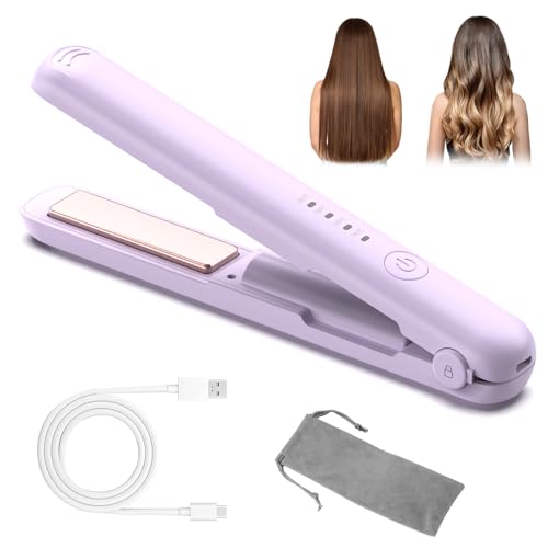 Cordless Hair Straightener, Mini Travel Flat Portable Wireless Rechargeable 2 in 1 Straightener and Curler Styling Tools Quick Heat Up & 4 Temp Adjustable Present for Women Christmas (Lila)