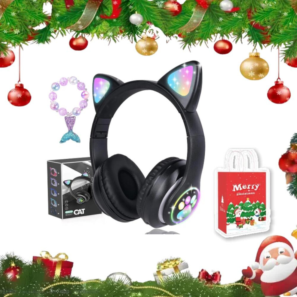 (Black)Christmas Gifts Bonus Box Wireless Headphones for Kids, Cat Ear LED Light Up Bluetooth Kids Headphones with Microphone for School/Travel/S